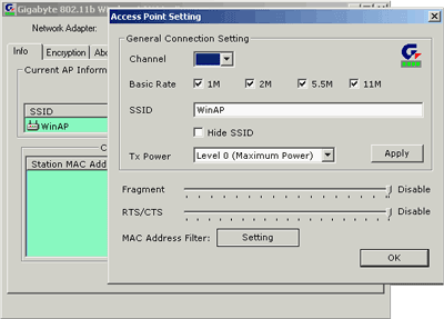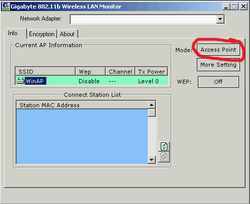 Особо остановлюсь лишь на возможности превратить WLBZ201 в беспроводную точку доступа, что возможно сделать под операционными системами семейства Windows 2k/XP. Для этого надо всего лишь переключить режимы работы устройства, нажав на соответствующую кнопку в интерфейсе настройки.