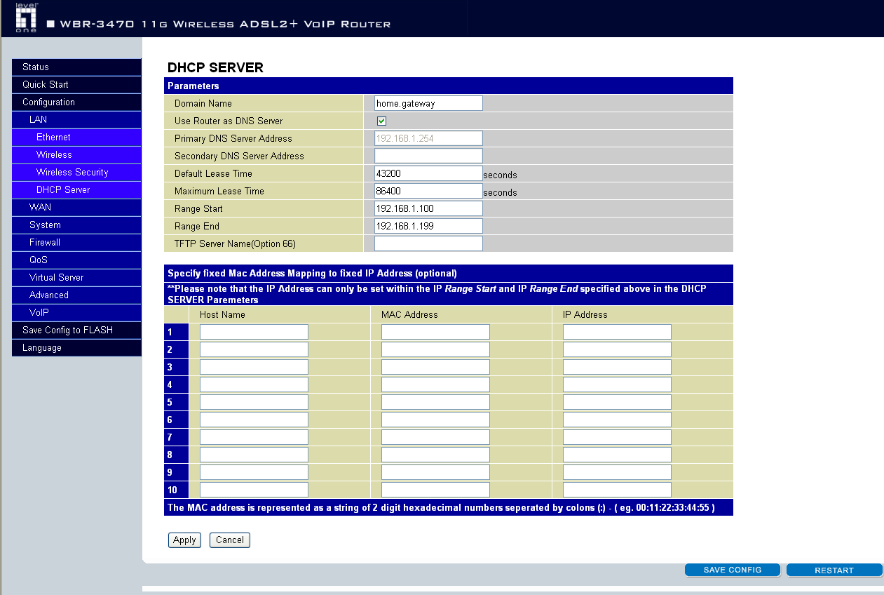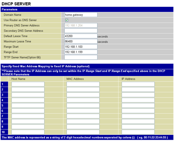 DHCP-сервер устройства позволяет задать достаточно много параметров, однако, судя по спецификации, пул IP-адресов, поддерживаемых устройством, может содержать до 100 записей. Из них только 10 записей можно задать статически.