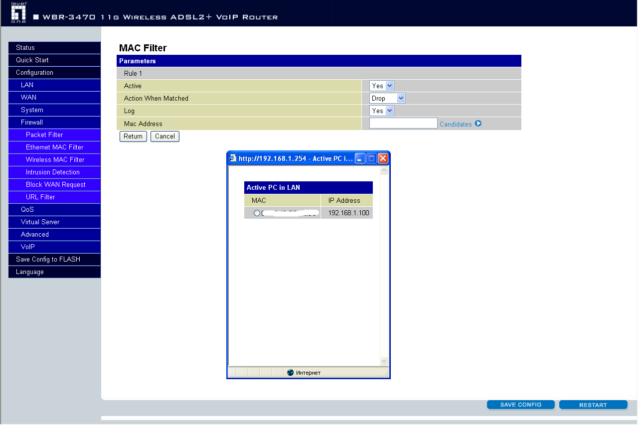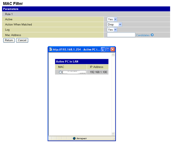 Устройство также поддерживает фильтрацию Ethernet-клиентов по MAC-адресу. При нажатии на ссылку "Candidates" — открывается окошко с текущими клиентами локальной сети, из которых можно выбрать MAC-адрес. Такая же страничка существует и для беспроводных клиентов.