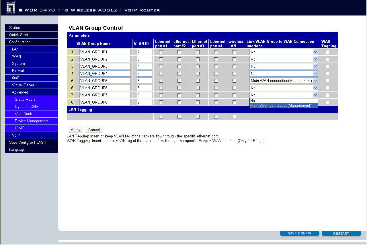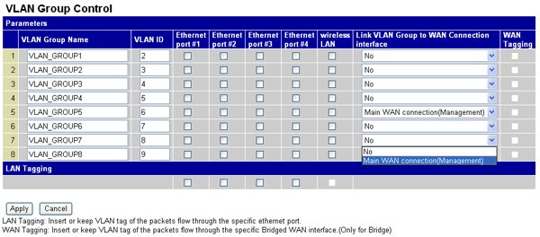 Устройство поддерживает работу с VLAN-ами, причем можно организовать до восьми VLAN-групп (притом, что Ethernet-портов всего четыре). На LAN-портах возможно использование Tagged-VLAN, когда трафик нескольких VLAN-ов передается через один Ethernet порт — данная возможность требует поддержки от оборудования.