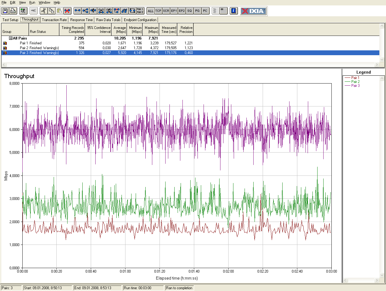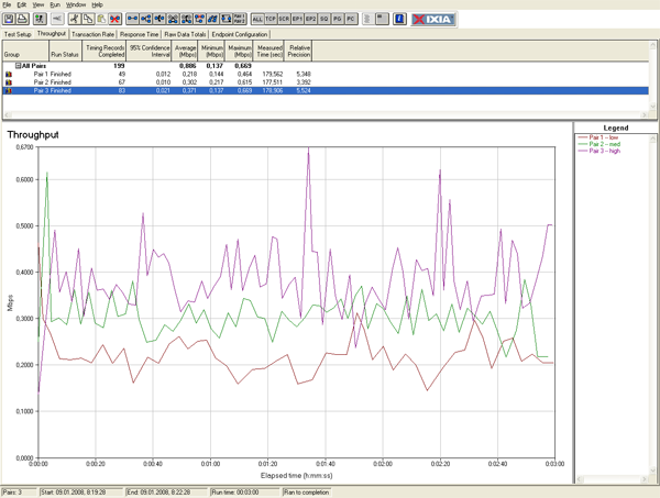 Напоследок был проведен тест, где использовалось 3 правила (и как следствие 3 потока трафика) с опцией Guaranteed и шириной полосы пропускания 15, 20 и 25 процентов соответственно. Приоритет трафика на все 3 потока устанавливался одинаковый. Общая ширина полосы пропускания во время теста была установлена в 12000 кбит/с.