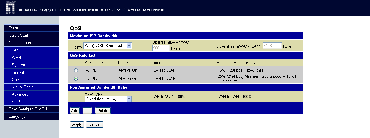 Шейпинг трафика работает достаточно четко… но только в случае, если он вообще работает. Мне так и не удалось заставить работать шейпинг трафика по приоритетам на входящем трафике — данная возможность показала себя только на исходящем (LAN -> WAN) трафике.