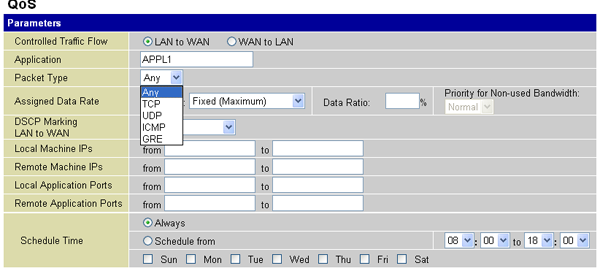 Здесь задаются точные параметры каждого правила шейпинга (направление трафика, протокол, ширина полосы пропускания в процентах, диапазоны IP-адресов машин источников/назначения пакетов… также возможно задание недельного расписания для каждого правила шейпинга).