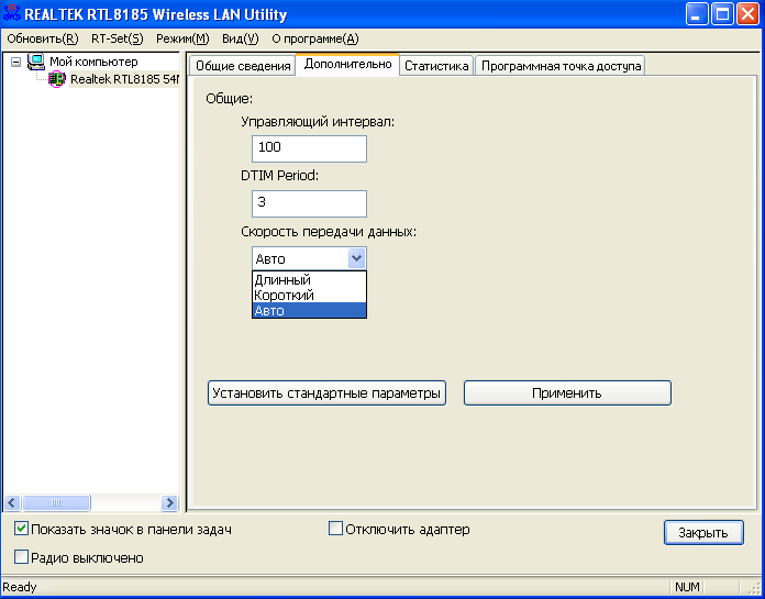 Используемые при тестировании данного беспроводного адаптера версии драйверов и утилиты были скачаны с сайта Realtek (здесь). Сразу скажу, что при использовании драйвера и утилиты настройки, идущих на диске в комплекте с устройством, мне не удалось использовать подключение в режиме AdHoc на скорости 54 Мбит/с (подключение производилось только на скорости 11 Мбит/с). Обновление только версии драйвера устройства также не исправило данную ситуацию (при использовании для настройки старой версии утилиты настройки), а помогло только комплексное обновление драйвера и утилиты.