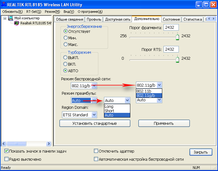 Использование режима Turbo, позволяющего производить подключение на скорости 72 Мбит/с вместо 54, судя по тестам, возможно только в режиме Infrastructure. Его использование в режиме AdHoc никак не отражалось ни на скорости подключения, ни на скорости трафика. Также возможен выбор региона или используемого для региона стандарта — от этого зависит сколько каналов беспроводной связи можно использовать.