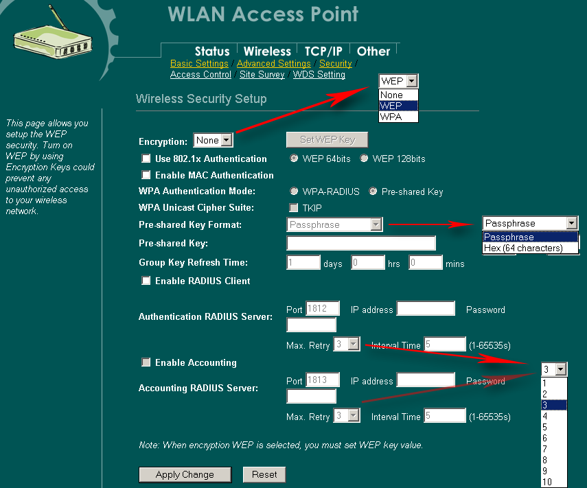 | WEP шифрование | 64/128bit | |||