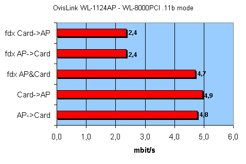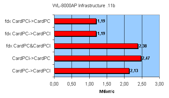 Тест LAN — WLAN режим Infrastructure — тест точки доступа: трафик гонялся между двумя компьютерами с двумя беспроводными адаптерами. Скорость соединения выставлялась в режим Auto mode. Тест производился с помощью Chariot NetIQ. Для теста использовались беспроводные адаптеры OvisLink WL-8000PCI и OvisLink WL-8000PCM. Расстояние между точками не превышало пяти метров.