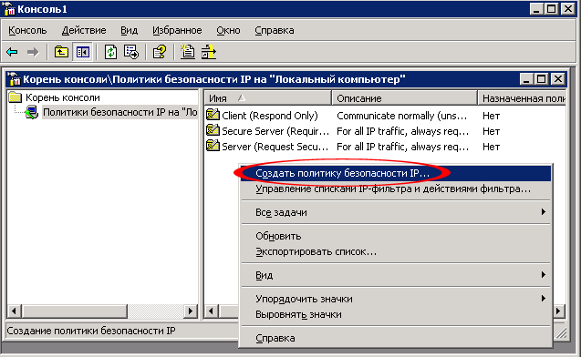 Нам нужно добавить собственную политику безопасности. Для этого в свободном месте правого окна щелкаем правой кнопкой мыши и выбираем пункт "Создать политику безопасности IP" как показано на следующем рисунке. Задание политики нужно для указания ОС что делать с трафиком, идущим в удаленную сеть или из нее.