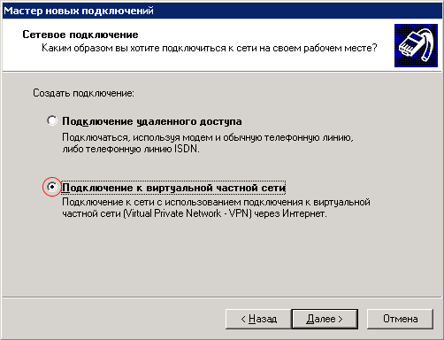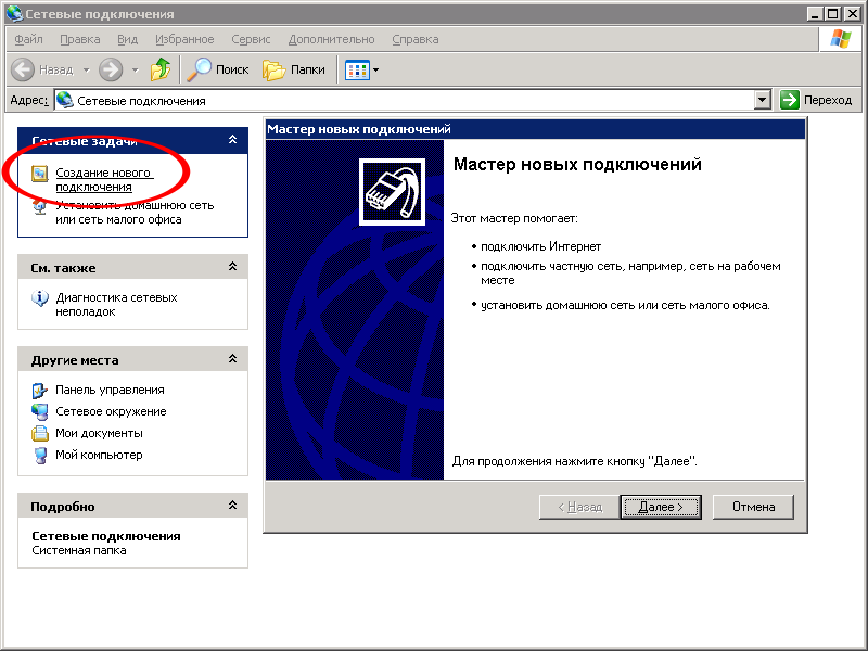 Для установки PPTP соединений в Windows XP используем "Мастер новых подключений", нажимаем кнопку "Далее":