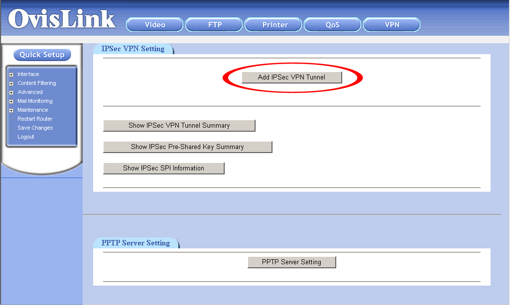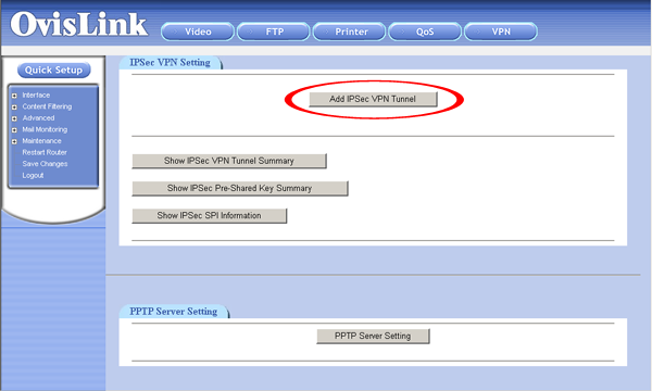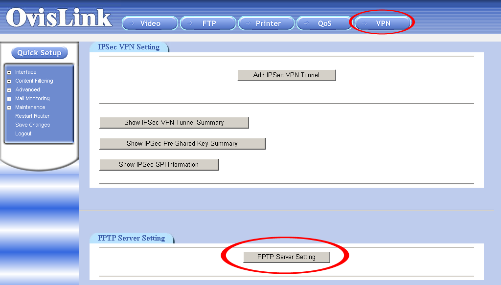 Для настройки роутера OvisLink WMU-9000VPN в веб-интерфейсе выбирается пункт "VPN", далее "PPTP Server Setting". Принципиальных отличий от установки PPTP-соединений в других роутерах нет.