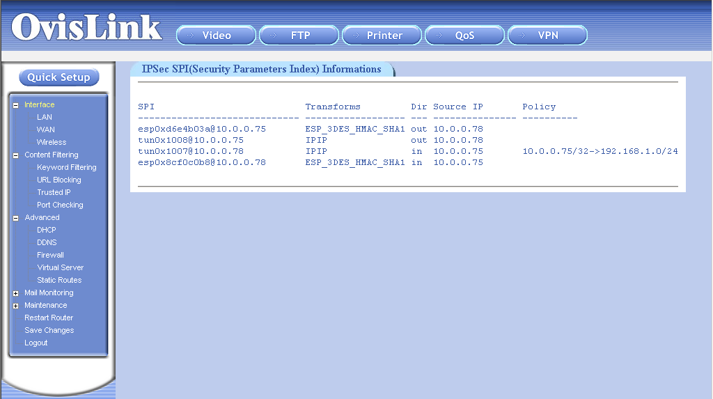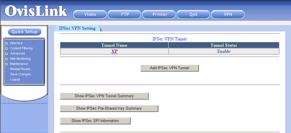 Данный роутер имеет типичные для подобных устройств набор настроек для IPSEC VPN. Для установки и настройки VPN-соединений в веб-интерфейсе роутера присутствует ссылка "VPN", нажав на которую мы попадаем в меню установки VPN-соединений. Для создания IPSEC соединения жмем кнопку "Add IPSec VPN Tunnel"