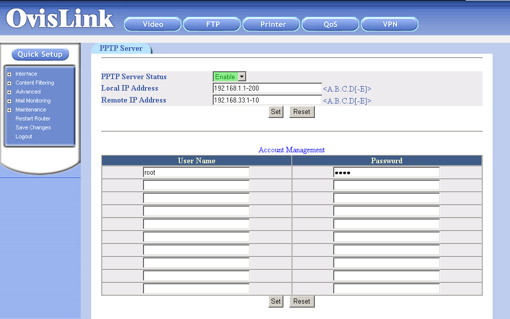 Мы попадаем в меню настройки сервера PPTP, выбираем Local IP Address (диапазон локальных адресов, доступных удаленным пользователям) и Remote IP Address (диапазон IP-адресов, выдаваемых пользователям, подключающимся удаленно). В нашем случае я задал Local IP Address: 192.168.1.1-200 и Remote IP Address: 192.168.33.1-10. Для подтверждения жмем на кнопку "Set". Далее заводим пользователя "root" с паролем "1234", для подтверждения жмем кнопку "Set":