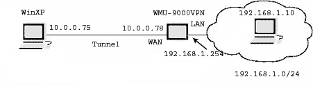 Защищенный туннель создается между нашим компьютером с Windows XP и роутером. Далее, в LAN-сегменте за роутером, трафик уже не зашифрован. Поэтому крайними точками туннеля являются компьютер с WinXP (10.0.0.75) и WAN-интерфейс роутера (10.0.0.78).