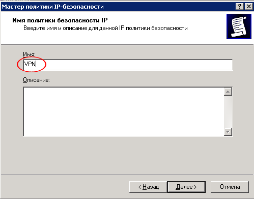 Нам необходимо ввести название политики безопасности (в данном случае я назвал ее "VPN"):