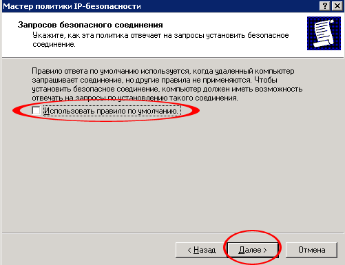 На следующем экране мастер предлагает использовать правило по умолчанию. Мы создаем собственные правила, поэтому снимаем галочку "использовать правило по умолчанию":