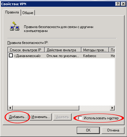 Мы попадаем в окно редактирования политики. Политика безопасности представляет собой набор правил, которые используются при связи с другими компьютерами в сети. Все правила мы будем задавать вручную, поэтому снимаем галочку "использовать мастер" и жмем кнопку "Добавить" для добавления нового правила:
