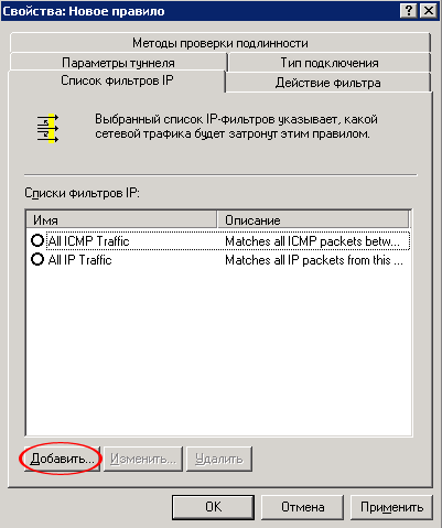 Далее нам нужно добавить еще одно правило к политике, которое будет отвечать за трафик от роутера к машине с WinXP. Для этого нажимаем кнопку "Добавить":