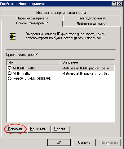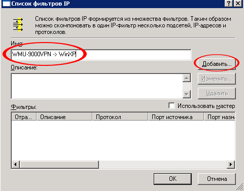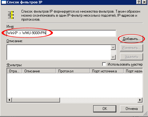 Называем список фильтров "WMU-9000VPN -> WinXP" и нажимаем кнопку "Добавить" для добавления нового фильтра в список фильтров: