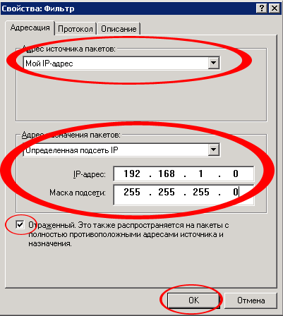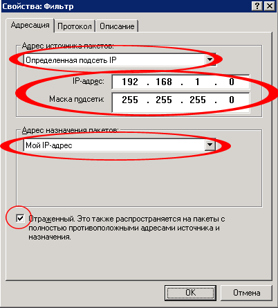Теперь адреса источника и назначения меняются на противоположные. Фильтр учитывает трафик от сети, спрятанной за роутером OvisLink WMU-9000VPN (192.168.1.0/24), к компьютеру с WinXP (10.0.0.75). В пункте "Адрес источника пакетов" выбираем пункт "Определенная подсеть IP" и вписываем адрес сети вместе с маской (192.168.1.0/255.255.255.0), а в пункте "Адрес назначения пакетов" выбираем пункт "Мой IP-адрес". Ставим галочку "отраженный" и жмем "ОК":