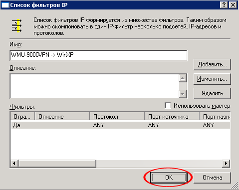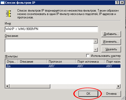После этого наш фильтр появляется в списке фильтров "WinXP -> WMU-9000VPN", жмем "ОК":