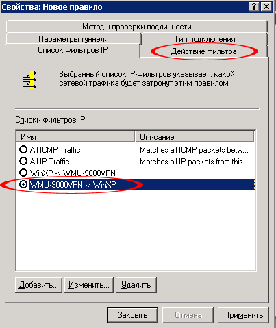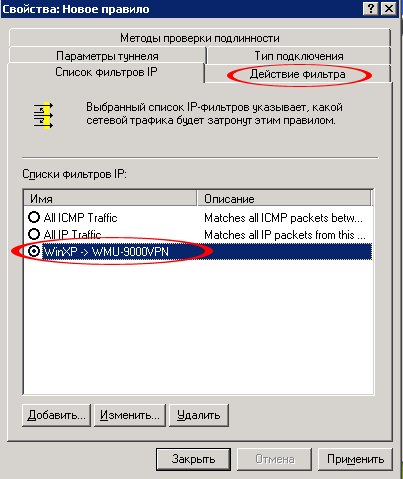Выбираем среди списков созданный нами фильтр "WMU-9000VPN -> WinXP" и переходим к вкладке "Действие фильтра":