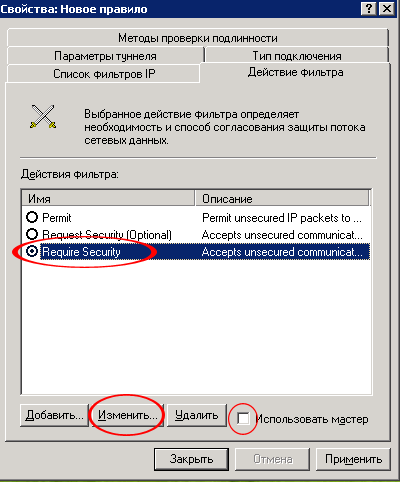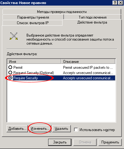 На вкладке "Действие фильтра" выбираем действие "Require Security" (требовать безопасность), снимаем галочку "Использовать мастер" и жмем кнопку "Изменить":