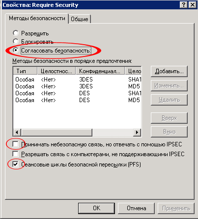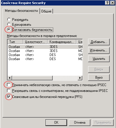 Выбираем "Согласовать безопасность", снимаем галочку "Принимать небезопасную связь, но отвечать с помощью IPSEC" и ставим галочку "Сеансовые циклы безопасной пересылки (PFS)". Этими установками мы не позволяем работать без шифрования — все незащищенные соединения будут отклонены.
