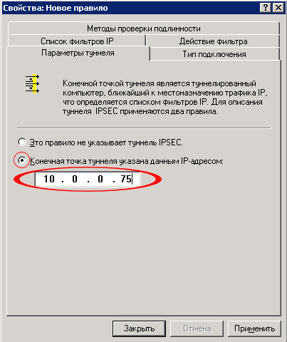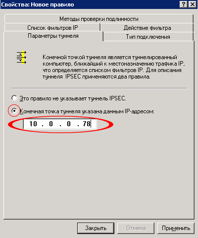 На следующем рисунке нам нужно указать конечную точку туннеля в направлении передачи трафика. Для созданного нами правила трафик идет от компьютера с Windows XP к роутеру (WinXP -> WMU-9000VPN), поэтому конечной точкой туннеля для этого правила будет IP-адрес WAN-интерфейса роутера. Вписываем адрес WAN-интерфейса (10.0.0.78) и переходим на вкладку "Методы проверки подлинности":
