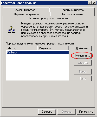Здесь мы должны указать конечную точку туннеля. В нашем случае трафик идет от роутера OvisLink WMU-9000VPN (10.0.0.78) к компьютеру с WinXP (10.0.0.75), поэтому конечной точкой туннеля будет выступать адрес нашего компьютера с Windows XP — 10.0.0.75 — вводим эти данные в окне. Далее переходим к вкладке "Методы проверки подлинности" и жмем на кнопку "Изменить":