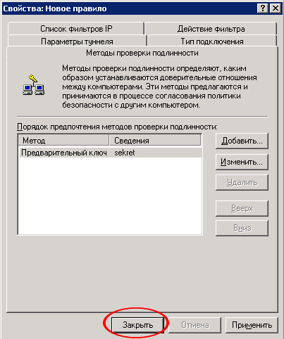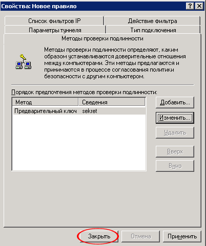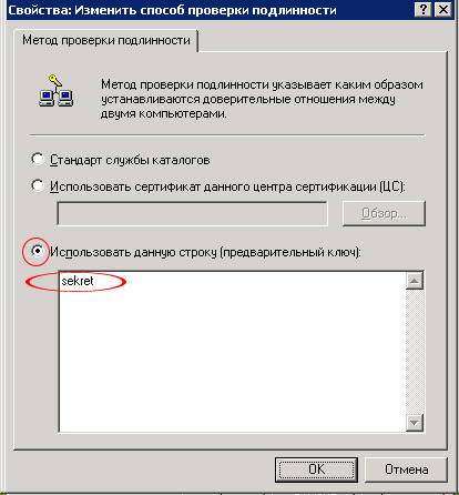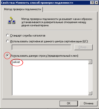 Как и при создании первого правила в политике безопасности выбираем использование предварительного ключа и вводим ту же самую строку "sekret", после чего жмем на "OK":