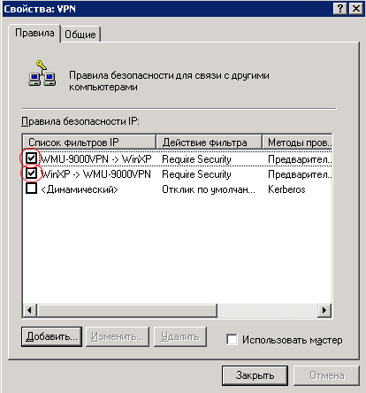 Выбираем оба созданных нами правила ("WinXP -> WMU-9000VPN" и "WMU-9000VPN -> WinXP") и жмем на кнопку "Закрыть":