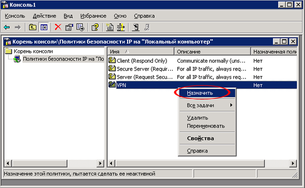 Политика безопасности "VPN" теперь полностью создана, и нам остается ее только включить. Для включения политики "VPN" щелкаем на ней в правом окне правок кнопкой мыши и выбираем пункт "Назначить":