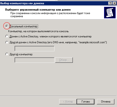После нажатия кнопки "добавить" мы должны указать, что политика безопасности применяется на локальном компьютере и жмем кнопку "Готово":