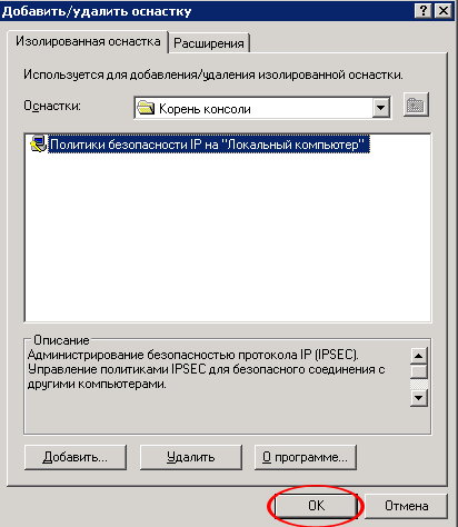 В корне консоли у нас появляется оснастка "Политики безопасности IP на Локальный компьютер", жмем "ОК" :