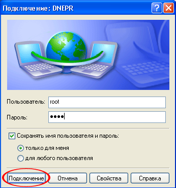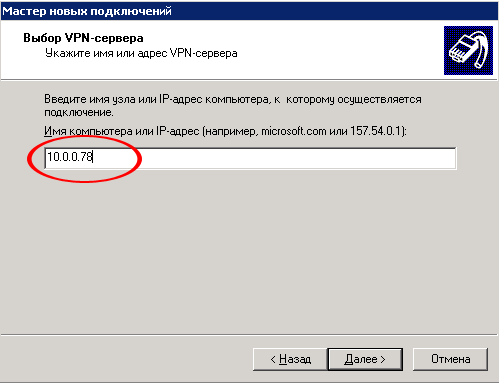 IP-адрес компьютера, к которому осуществляется подключение — адрес PPTP-сервера (в нашем случае 10.0.0.78)