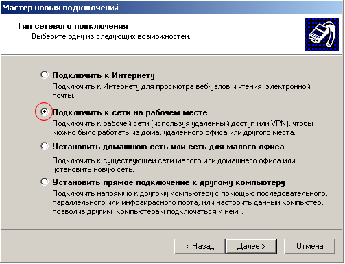 Выбираем пункт "Подключить к сети на рабочем месте" и жмем "Далее":
