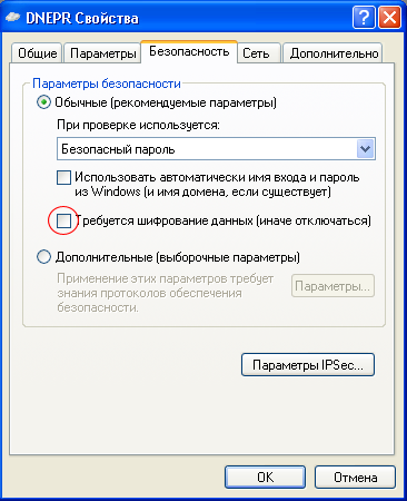 Здесь у нас довольно большой набор параметров, но в большинстве случаев достаточно использования параметров по умолчанию. Роутер OvisLink WMU-9000VPN не поддерживает шифрования, когда выступает в роли PPTP VPN-сервера, поэтому на этой вкладке нам нужно снять галочку "Требуется шифрование данных (иначе отключаться)". В завершение жмем "OK":