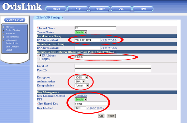 - Pre-Shared Key — предварительный ключ. Для данного примера предварительным ключом будет фраза "sekret". Эта фраза должна совпадать на обоих концах туннеля (на компьютере с Windows XP и на роутере).