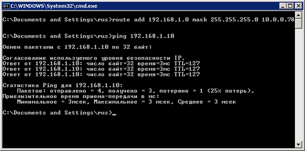 Для обхода этой особенности Windows нам нужно вручную прописать путь к сети 192.168.1.0/24: шлюзом для этой сети будет служить WAN-адрес роутера (10.0.0.78). Для добавления записи в таблицу маршрутизации на компьютере с Windows XP воспользуемся командой route: