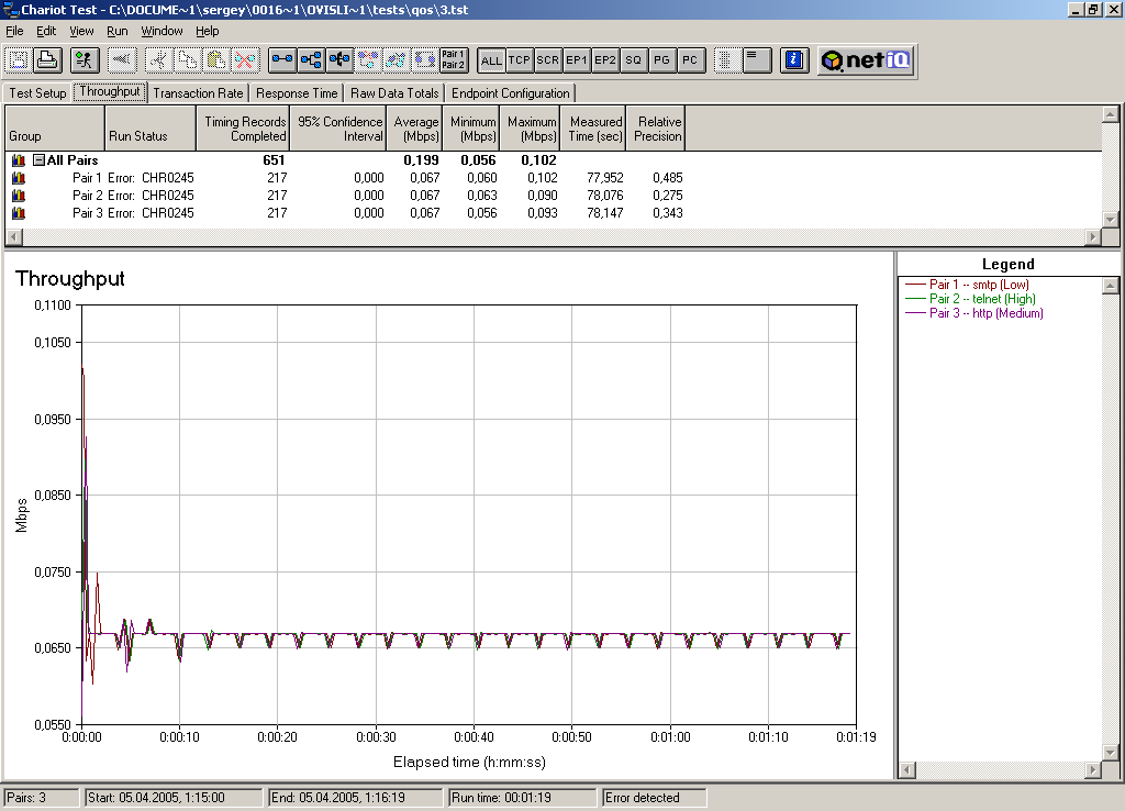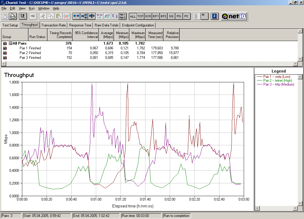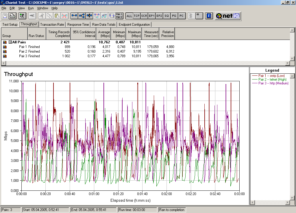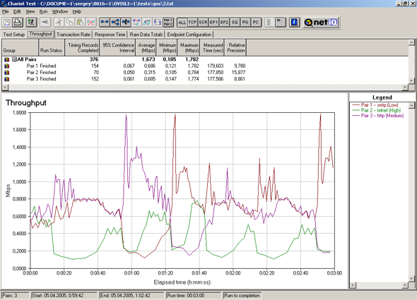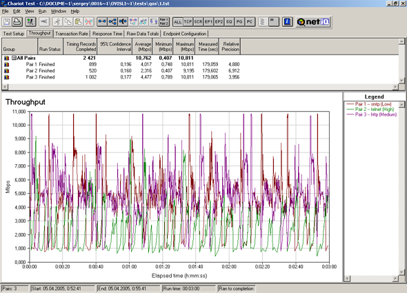 Для тестирования мы гоняли 3 различных вида трафика (Telnet, HTTP, SMTP). Менялись приоритеты на трафик и ширина канала для трафика определенного приоритета.