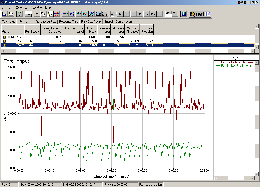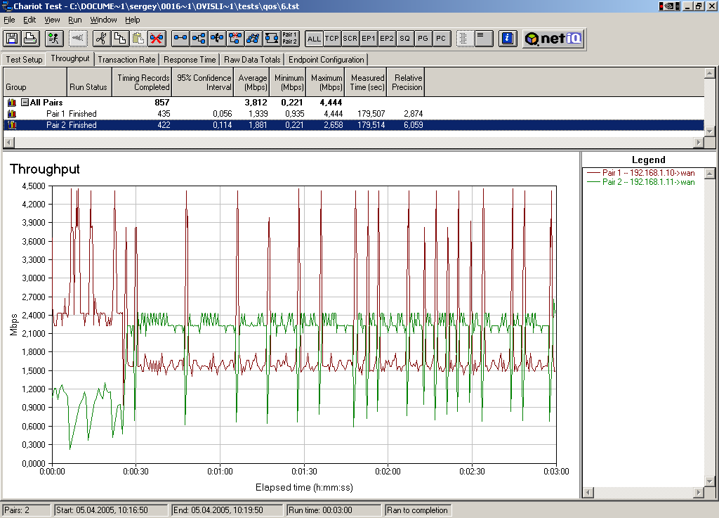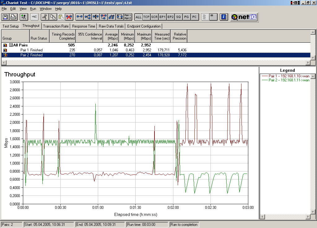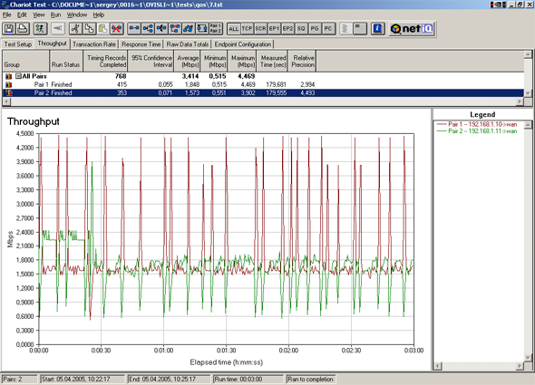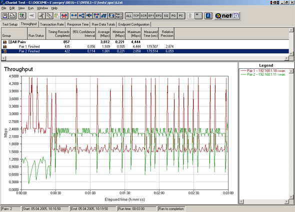 Устанавливаем пропускную способность по приоритетам в 1 кбит/с для каждого приоритета, пропускную способность по IP-адресам устанавливаем в 2000 кбит/с, для первого IP-адреса ставим приоритет High, а для второго Low. Тест идет 3 минуты. Через 1.5 минуты после начала меняем приоритеты High <-> Low.