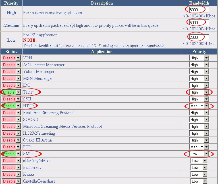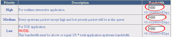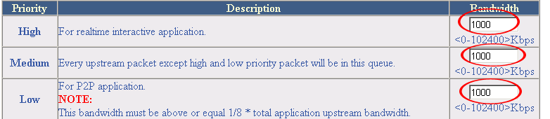 Приоритеты на трафик оставались неизменными (Telnet — High; HTTP — medium; SMTP — Low), а ширина канала для всех приоритетов устанавливалась в 1000 кбит/с, как показано на рисунке: