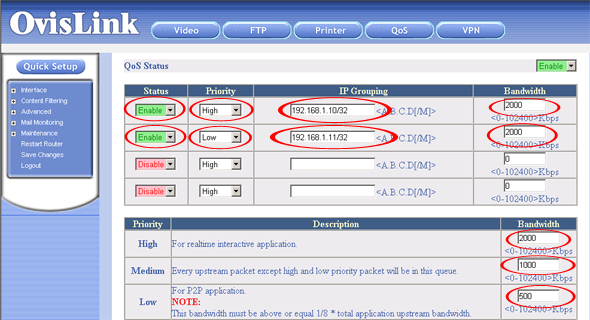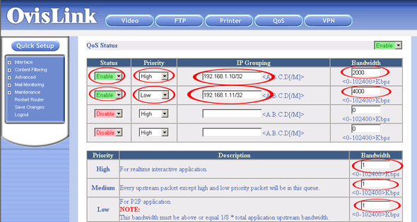 Устанавливаем ширину канала для всех приоритетов в 1 кбит/с. Ширина канала для первого IP адреса устанавливается в 2000 кбит/с, а для второго — в 4000 кбит/с, причем первому назначается приоритет High, а второму — Low.