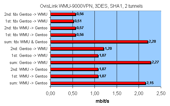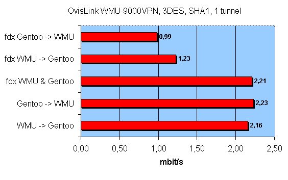 Максимальная скорость: 2.23 Мбит/с — очень низкий показатель для 3des шифрования, а если еще одновременно использовать все 100 туннелей, которые позволяют создать роутер — результат, думаю, сильно разочарует. В полнодуплексном режиме график распределения скоростей выглядит так: