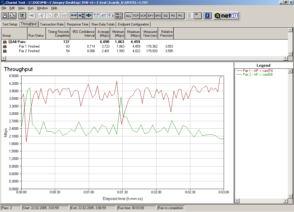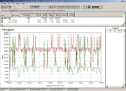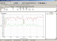 Тест LAN-WLAN 1 карта — трафик гонялся между компьютером с беспроводной сетевой картой и компьютером локального (LAN) сегмента. Скорость соединения устанавливалась в Auto mode. Тест проводился для трех режимов: 802.11b ; 802.11g ; AfterBurner Mode. Для тестирования использовалась беспроводная сетевая карта TRENDnet TEW-401PCplus PCMCIA Card. Тест производился с помощью Chariot NetIQ. Расстояние между точками не превышало пяти метров.