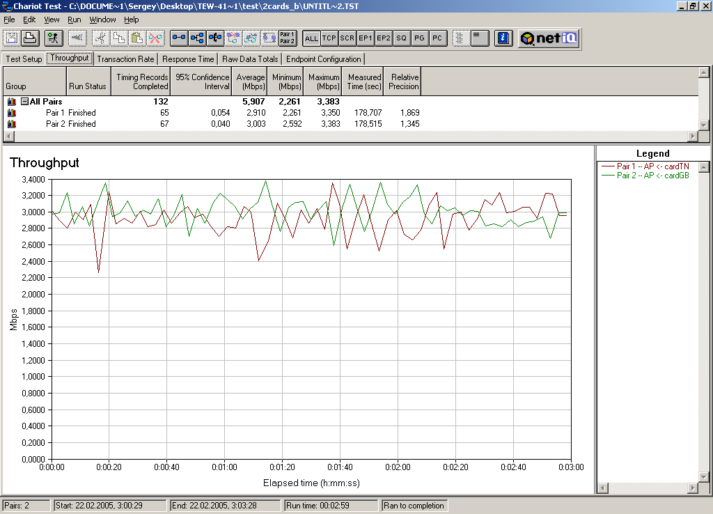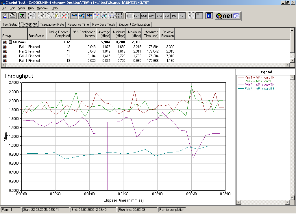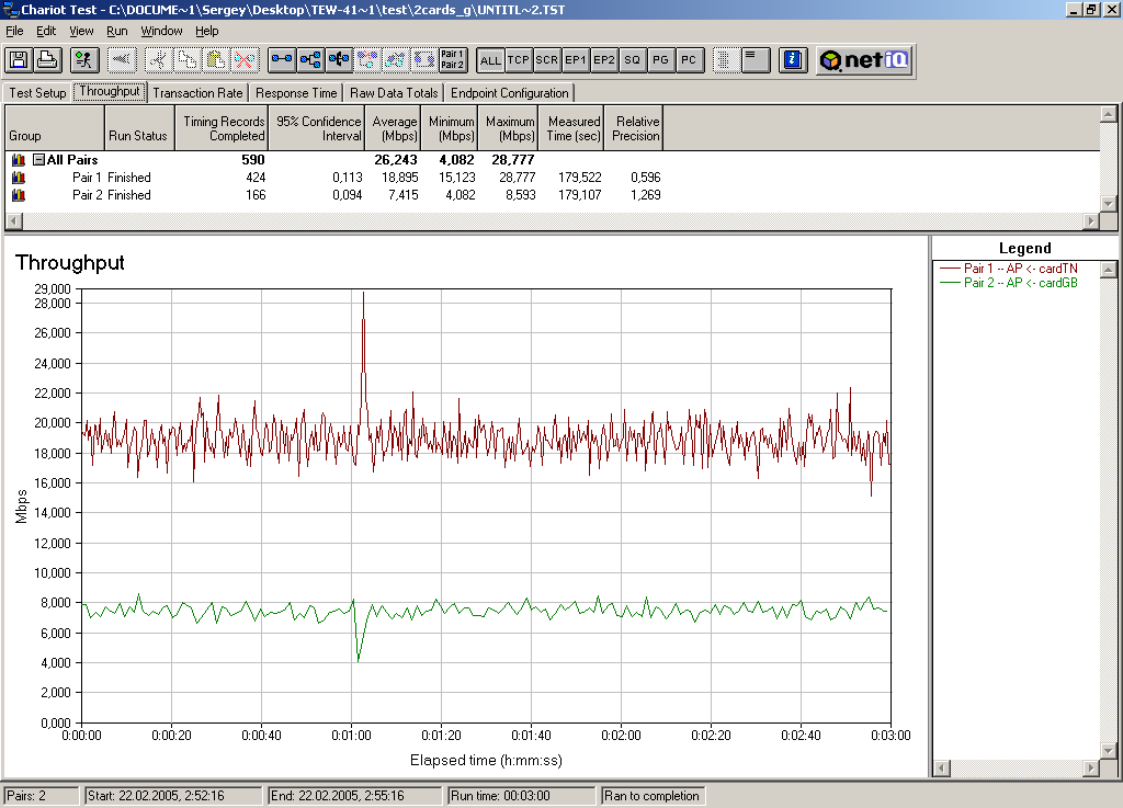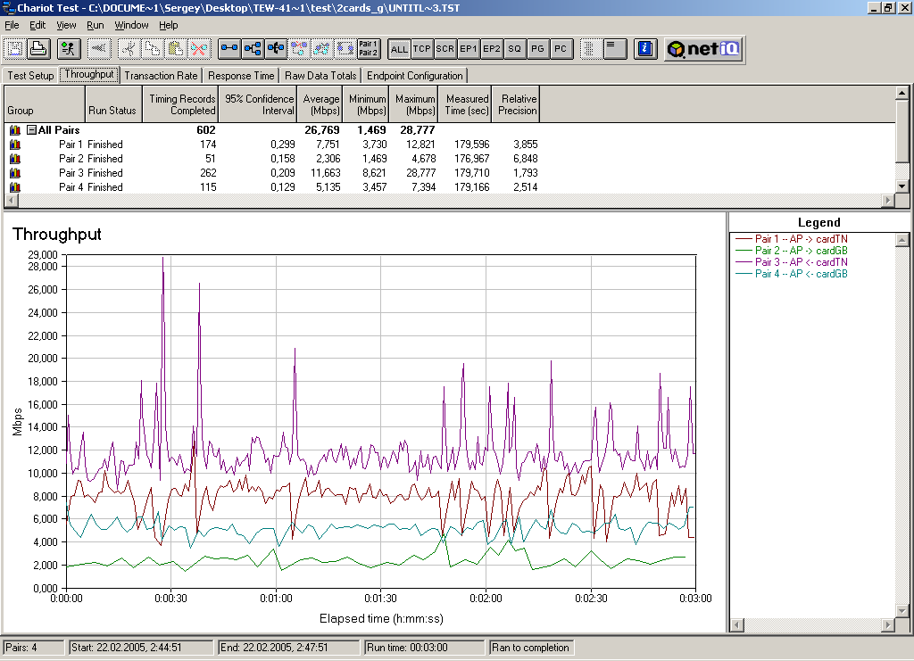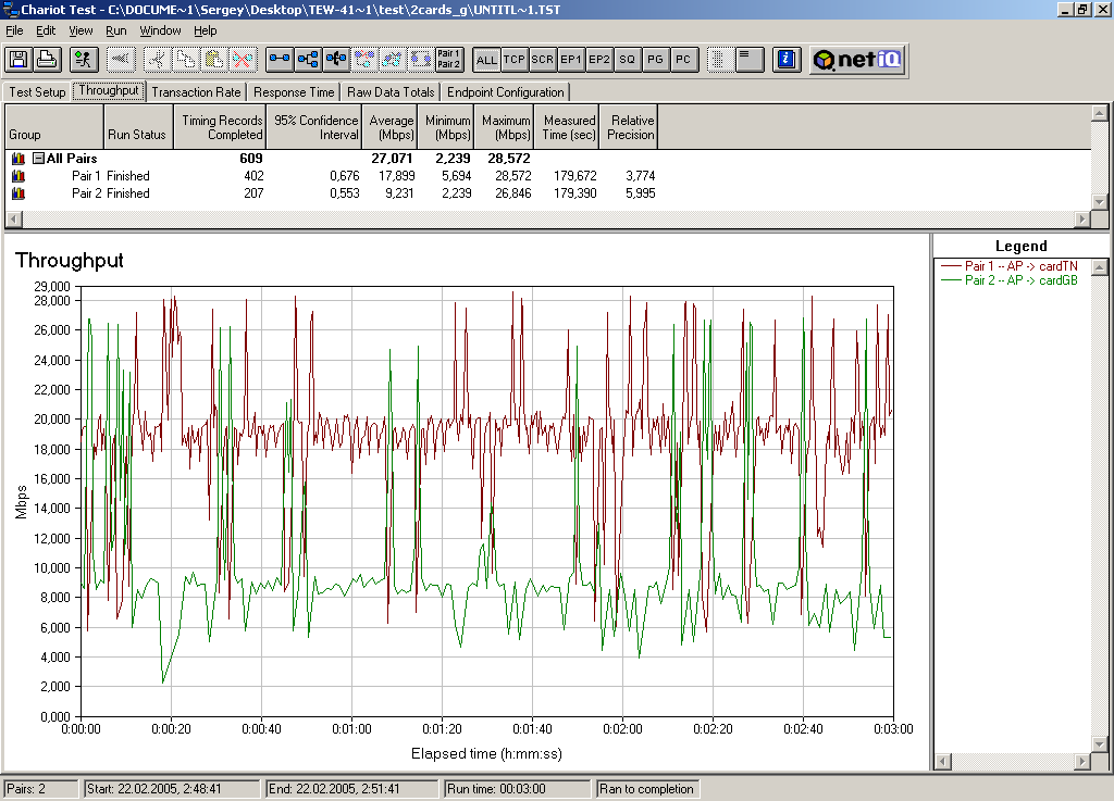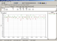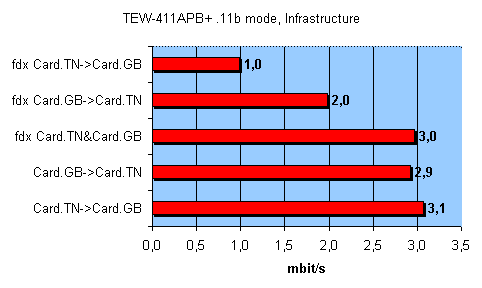 Тест WLAN-WLAN режим Infrastructure — трафик гонялся между двумя компьютерами с беспроводными сетевыми картами через точку доступа (режим Infrastructure). Скорость соединения устанавливалась в Auto mode. Тест проводился для двух режимов: 802.11b ; 802.11g. Для тестирования использовалась беспроводная сетевая карта TRENDnet TEW-401PCplus PCMCIA Card и Gigabyte 802.11g PCI WLAN Card. Тест производился с помощью Chariot NetIQ. Расстояние между точками не превышало пяти метров.