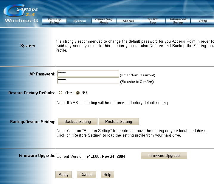 Есть возможность сохранения настроек. Хранение логов осуществляется только на внешнем лог-сервере. Режимы беспроводной связи: 11b+g; 11b only; 11g only; AfterBurner. Присутствует поддержка SNMP, но через нее можно получить только информацию об устройстве и его владельце, которую вы сами задаете.