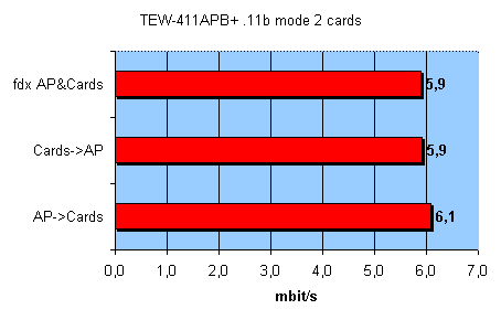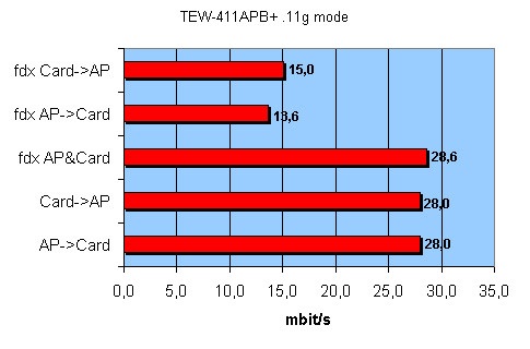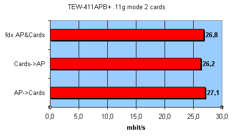 Точка доступа TEW-410APB+ в паре с сетевой картой TEW-401PCplus обладает высокой производительностью как при работе в .11b режиме, так и в 11g режиме, но странным образом снижают производительность сетевых карт других производителей при масштабировании. Возможности технологии AfterBurner окончательно еще не реализованы, может статься, с выпуском новой версии прошивки что-то изменится.