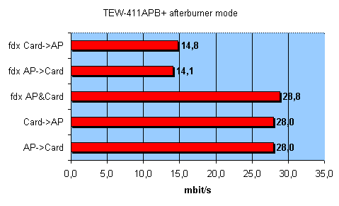 Режим AfterBurner, по заявлениям разработчиков устройства, теоретически способен повысить пропускную способность радиоканала до 125 Мбит/с, но практически это пока остается теорией, что видно из следующих результатов.