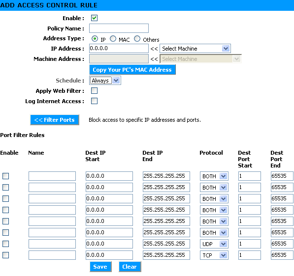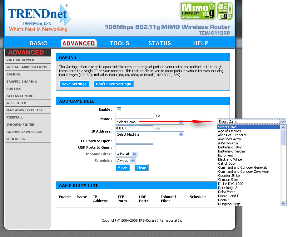 Пункт "Gaming", по сути, является аналогией виртуальных серверов — то есть мы открываем для пользователей из внешней сети доступ к серверам внутренней сети по определенным портам. Разница заключается в том, что используя "Gaming" мы можем одним правилом задать диапазоны используемых ТСP и UDP-портов, а также IP-адрес сервера во внутренней сети.